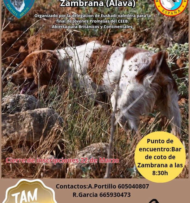Cartel del evento Colaboran Información del Evento Descripción del evento: Prueba de Aptitudes Naturales abierta a todas las razas britanicas y continentales.Valedera para la final de jóvenes promesas de la Monográfica 2026 Fecha: 28 de marzo Ubicación: Zambrana (Álava). Punto de encuentro Bar de coto de Zambrana, a las 08:30h Precio socios: 15 € Precio